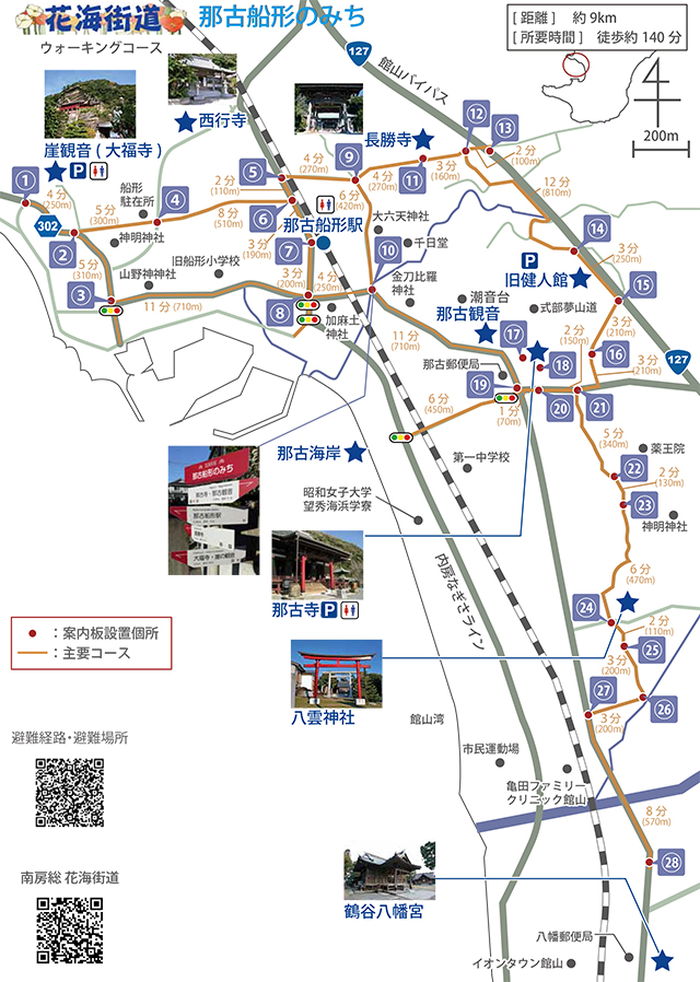 1. 那古船形のみち 自然と歴史を満喫できるコースです。おすすめは崖の観音や那古観音から眺める夕暮れの館山湾と富士山! 「那古船形のみち(表面)」印刷用PDF 「那古船形のみち(裏面)」印刷用PDF おすすめスポット 崖観音(がけかんのん) 西行寺(さいぎょうじ) 長勝寺(ちょうしょうじ) 那古寺(なごじ) 八雲神社(やぐもじんじゃ) 鶴谷八幡宮(つるがやはちまんぐう)
