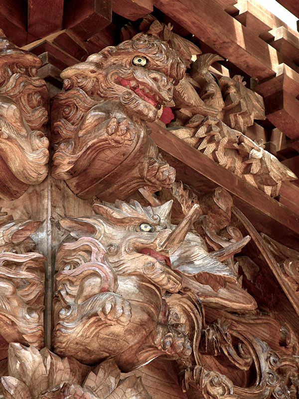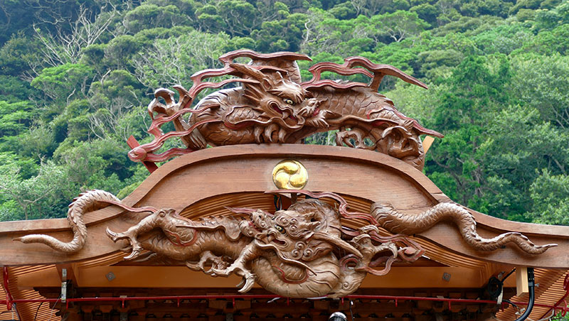 前方の鬼板と破風には三体の龍と「志久町」の文字の扁額。欄間には花鳥、スサノオノミコト、ヤマタノオロチ、天岩戸の天照大神、高欄八面には中国の「二十四孝」の彫刻、精巧な枡組につけられた木鼻は、珍しい趣向の「獅子と獏の二段飾り」など見応えのある彫刻があります。また、屋台制作時から奏でるお囃子が関連していたのか房州屋台では珍しい四方を勾欄で囲まれた造りとなっています。