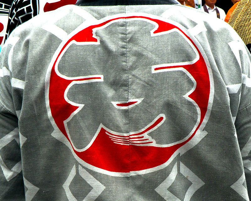 - 提灯:赤地に白の卍と巴紋