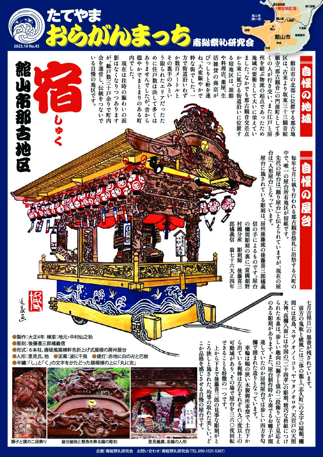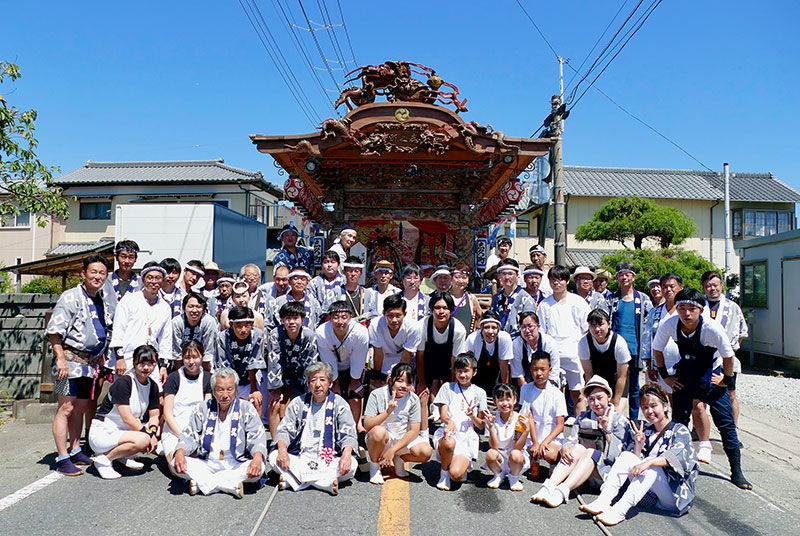 那古地区の中でも特に町域が狭く世帯数の少ない町内ですが、先人が残してくれた立派な屋台を大切にしながら伝統を引き継いでいます。祭礼時の役職は一人が何役もこなし、互いに助け合いながらほとんどの祭礼の運営を行っています。