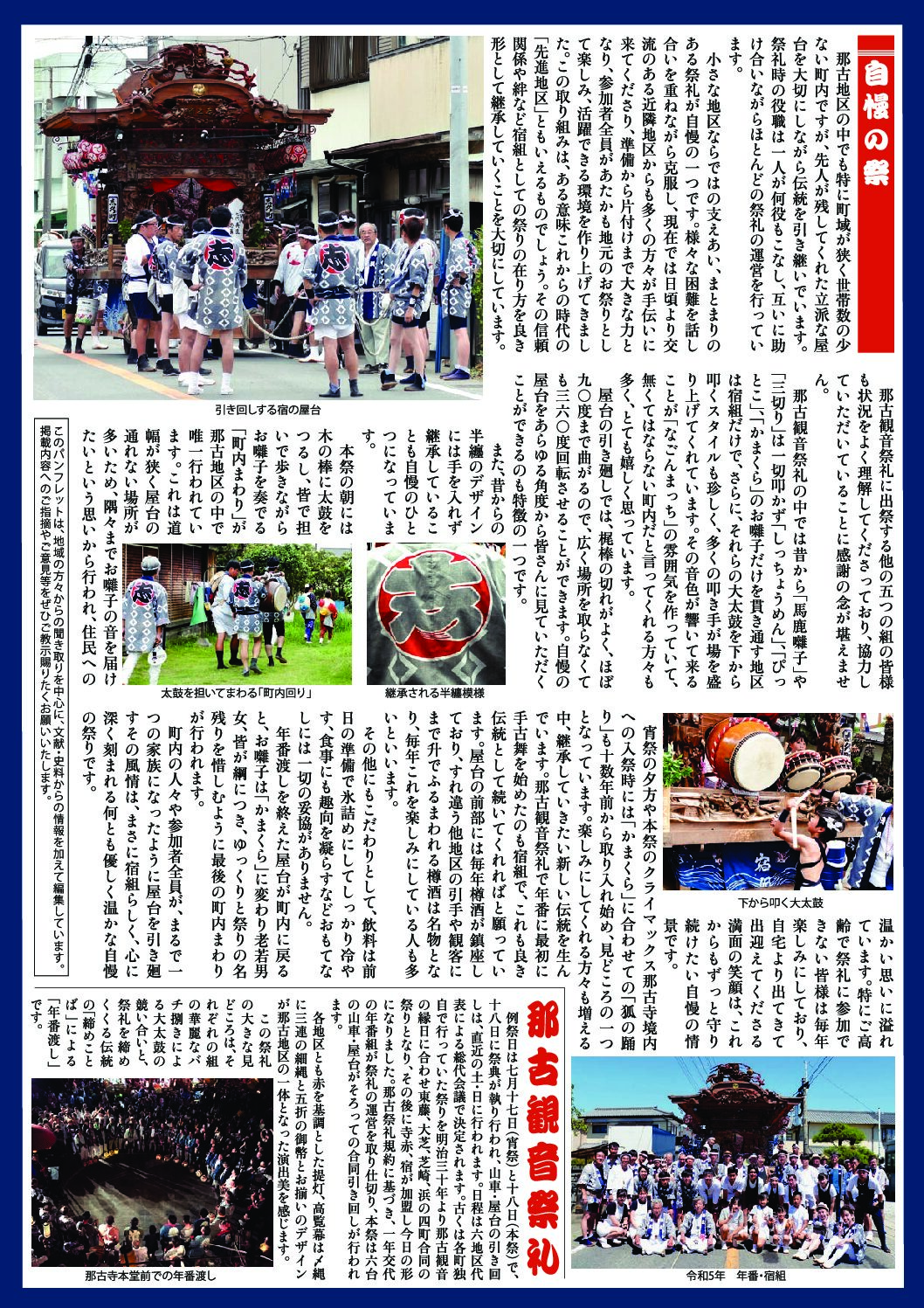那古観音祭礼の中では昔から「馬鹿囃子」や「三切り」は一切叩かず「しっちょうめん」、「ぴっとこ」、「かまくら」のお囃子だけを貫き通す地区は宿組だけで、さらに、それらの大太鼓を下から叩くスタイルも珍しく、多くの叩き手が場を盛り上げてくれています。その音色が響いて来ることが「なごんまっち」の雰囲気を作っていて、無くてはならない町内だと言ってくれる方々も多く、とても嬉しく思っています。