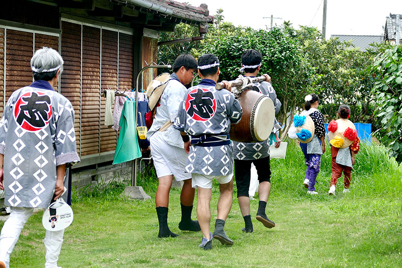 本祭の朝には木の棒に太鼓をつるし、皆で担いで歩きながらお囃子を奏でる「町内まわり」が那古地区の中で唯一行われています。これは道幅が狭く屋台の通れない場所が多いため、隅々までお囃子の音を届けたいという思いから行われ、住民への温かい思いに溢れています。特にご高齢で祭礼に参加できない皆様は毎年楽しみにしており、自宅より出てきて出迎えてくださる満面の笑顔は、これからもずっと守り続けたい自慢の情景です。