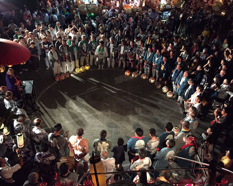 この祭礼の大きな見どころは、それぞれの組の華麗なバチ捌きによる大太鼓の競い合いと、祭礼を締めくくる伝統の「締めことば」による「年番渡し」です。