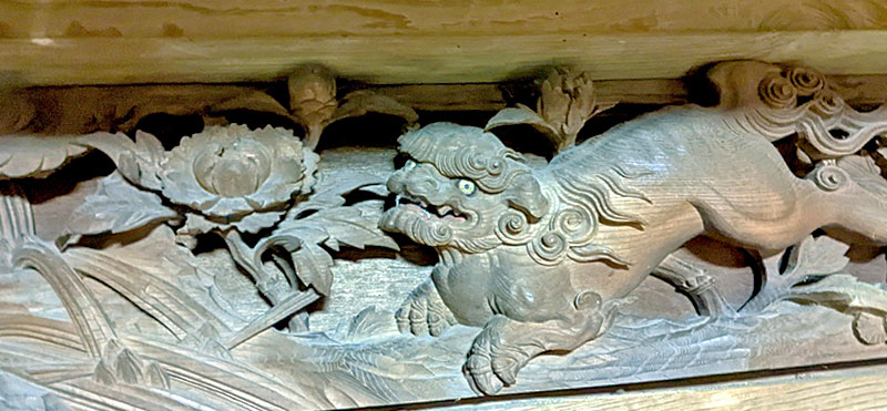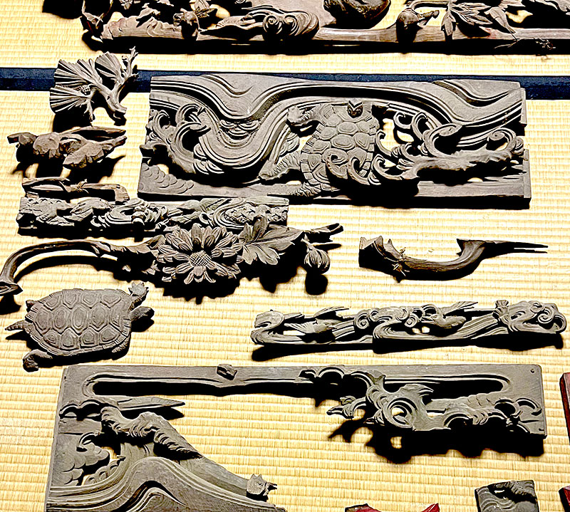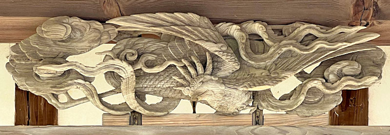 八雲神社拝殿の奥には、現在の屋台が出来る以前に柳塚にあったとされる百年以上前の山車彫刻が本殿入口周りに取り付けられていて、その他の彫刻の一部も保管されています。