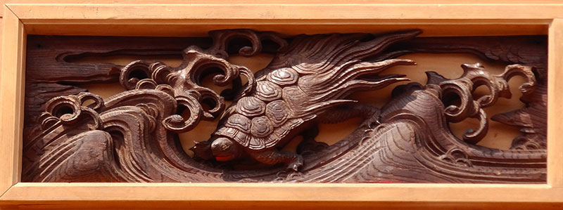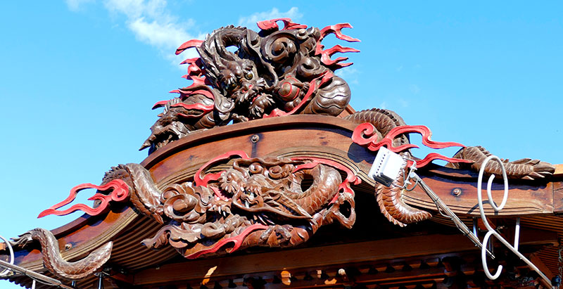 まず大きな鬼板と破風に巻き付く二体の龍が目を見張り、箱棟にまで彫刻が飾られる屋台はあまり数を見ませんが、この箱棟彫刻の波に簑亀、龍などは彫刻師は不明ですが、先代にあった山車のものと伝われています。