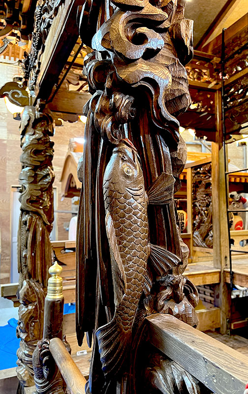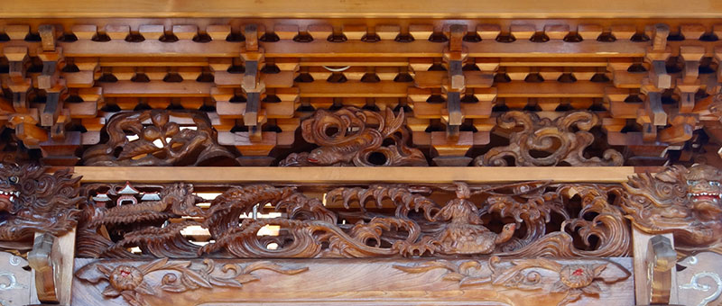 屋根を支える美しい斗組と欄間彫刻には鳳凰や弁慶と牛若丸の五条橋、亀に乗る浦島と竜宮城の場面、屋台内部蛙股には地元産品の枇杷が彫られ、前方柱に龍、後方柱に鯉の滝登り、脇障子に松に鷹、勾欄には獅子に牡丹、波に簑亀と繊細でいきいきとした小島松連の彫刻がところ狭しと施されています。