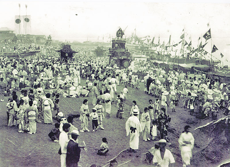 昭和五十年初め頃までの船形祭礼の見せ場は、なんと言っても山車を砂浜に入れて曳き回す「お浜出」でした。山車の前車輪部に丸太で組んだやぐらを入れ、持ち上げては引っ張り、また持ち上げては引っ張る、船形の漁師たちの熱い心意気があふれ、その光景は勇壮かつ豪快で担ぎ手、引き手、観客が一体となった感動の連続でした。しかし昭和五十二年、この浜に防波堤が作られたため、「お浜出」ができなくなり、昭和六十二年に堂の下区が行ったのが最後となりました。
