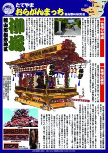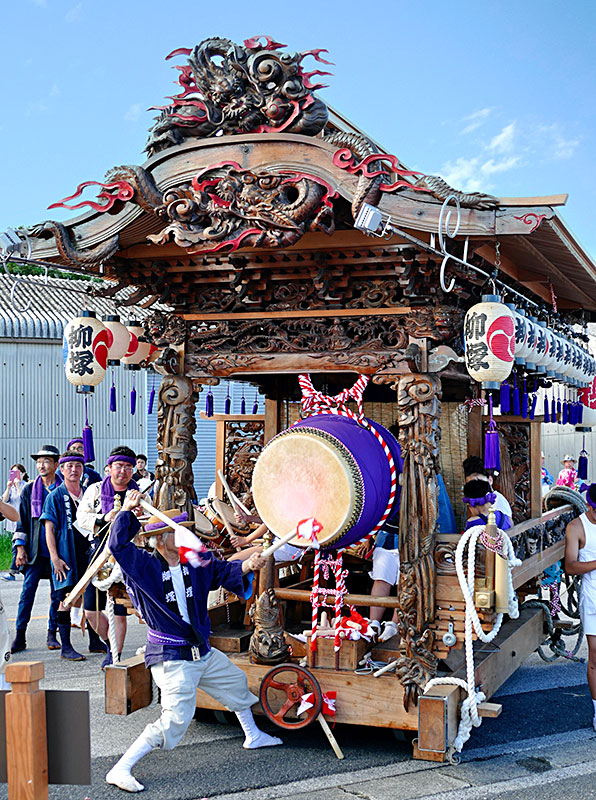 船形祭礼には二つの地区から屋台が出祭しますが、そのうちの黒いほうの屋台が柳塚、昭和六十二年の大改修を経てますます魅力を増し、二尺の大太鼓の迫力の音を鳴り響かせながら曳き回す、柳塚の人々の自慢の屋台です。